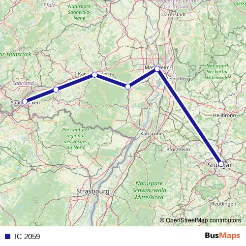 The first stop of the IC 2059 rail route is Saarbrücken Hbf and the last stop is Stuttgart Hbf. IC 2059 is operational during everyday.