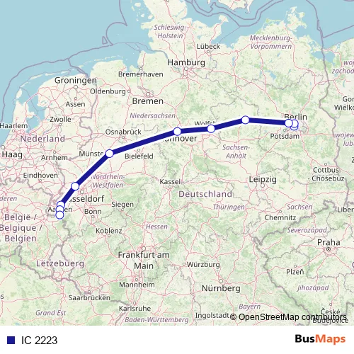 The first stop of the IC 2223 rail route is Berlin Südkreuz and the last stop is Aachen Hbf. IC 2223 is operational during on weekdays.