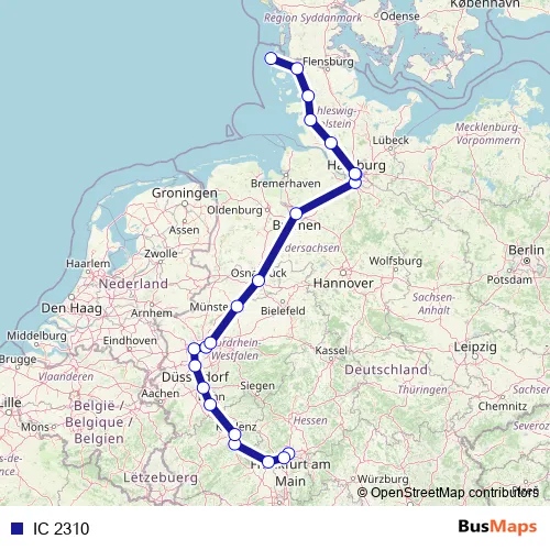 The first stop of the IC 2310 rail route is Frankfurt(Main)Hbf and the last stop is Westerland(Sylt). IC 2310 is operational during everyday.