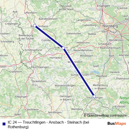 The first stop of the IC 24 rail route is Treuchtlingen and the last stop is Steinach (b.Rothenb.). IC 24 (Treuchtlingen - Ansbach - Steinach (bei Rothenburg)) is operational during everyday.