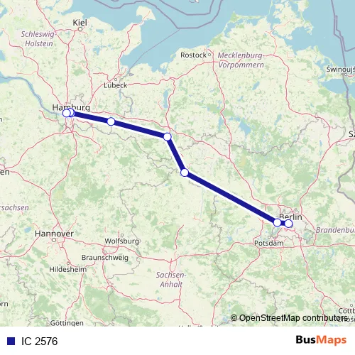 The first stop of the IC 2576 rail route is Berlin Hbf (tief) and the last stop is Hamburg-Altona. IC 2576 is operational during everyday.