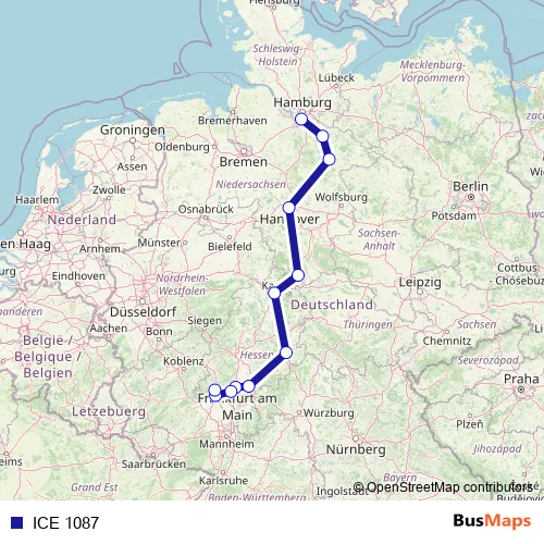 The first stop of the ICE 1087 rail route is Hamburg-Altona and the last stop is Wiesbaden Hbf. ICE 1087 is operational during on weekends.