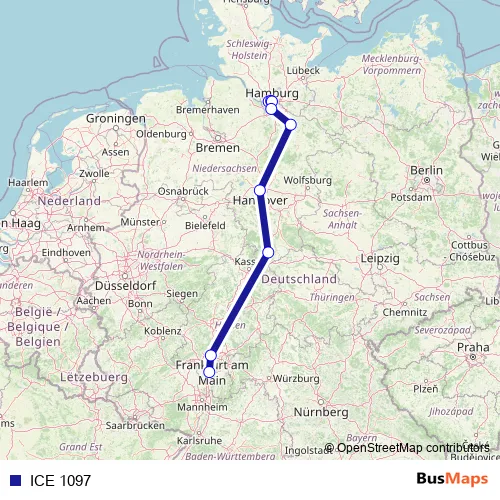 The first stop of the ICE 1097 rail route is Hamburg-Altona and the last stop is Frankfurt(Main)Hbf. ICE 1097 is operational during on weekdays.