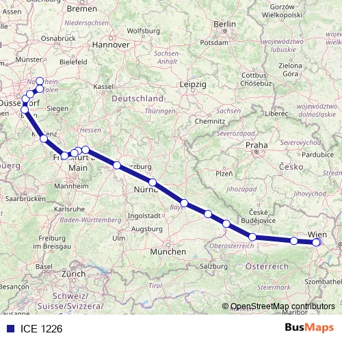 The first stop of the ICE 1226 rail route is Wien Hbf and the last stop is Dortmund Hbf. ICE 1226 is operational during on weekends.