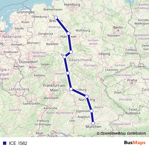 The first stop of the ICE 1582 rail route is München Hbf and the last stop is Bremen Hbf. ICE 1582 is operational during everyday.