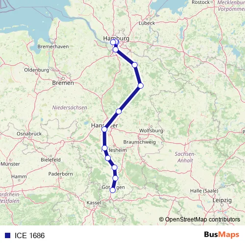 The first stop of the ICE 1686 rail route is Göttingen and the last stop is Hamburg-Altona. ICE 1686 is operational during on weekdays.