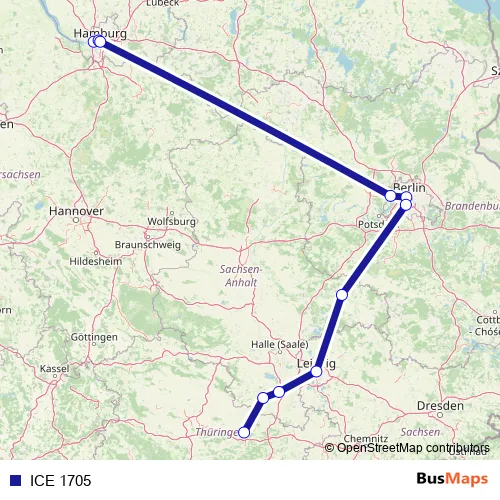 The first stop of the ICE 1705 rail route is Hamburg-Altona and the last stop is Jena Paradies. ICE 1705 is operational during everyday.
