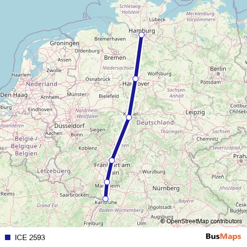 The first stop of the ICE 2593 rail route is Hamburg Hbf and the last stop is Karlsruhe Hbf. ICE 2593 is operational during everyday.