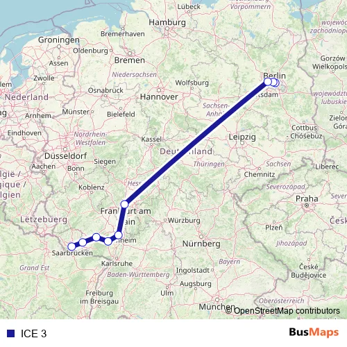 The first stop of the ICE 3 rail route is Berlin Ostbahnhof and the last stop is Saarbrücken Hbf. ICE 3 is operational during everyday.