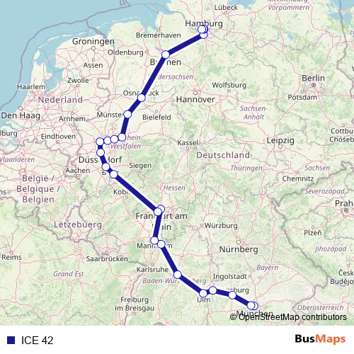 The first stop of the ICE 42 rail route is München Hbf and the last stop is Hamburg-Altona(S). ICE 42 is operational during everyday.