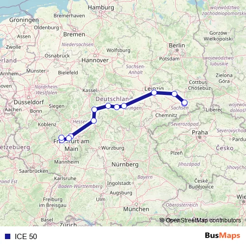 The first stop of the ICE 50 rail route is Dresden Hbf and the last stop is Frankfurt(Main)Hbf. ICE 50 is operational during everyday.