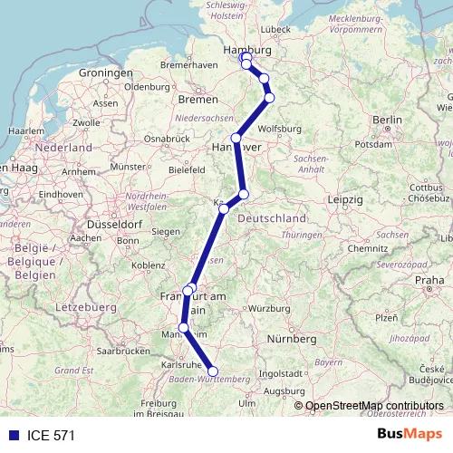 The first stop of the ICE 571 rail route is Hamburg-Altona and the last stop is Stuttgart Hbf. ICE 571 is operational during everyday.