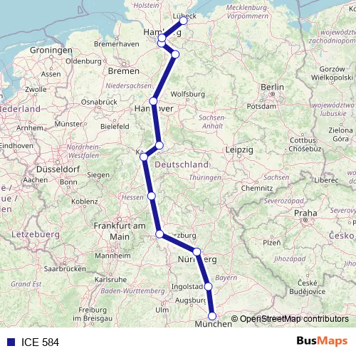The first stop of the ICE 584 rail route is München Hbf and the last stop is Lübeck Hbf. ICE 584 is operational during everyday.