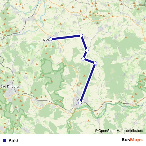 The first stop of the Km6 bus route is Nieheim, Zob and the last stop is