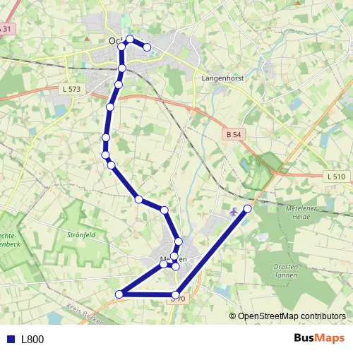 The first stop of the L800 bus route is Ochtrup, Schulzentrum and the last stop is Metelen, Heide. L800 is operational during on weekdays.