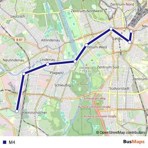 See why over 2 million users trust and consider busmaps.com as the best public transport website. busmaps gives you Leipzig Buses suggested routes, real-time bus tracker, line route maps in Leipzig, and helps to find the closest M4 bus stops near you. No internet available? Download an offline PDF map and bus schedule for the M4 bus to take on your trip.