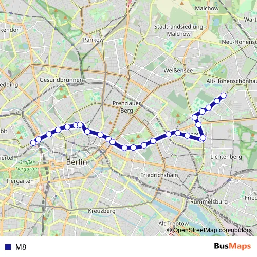 See why over 2 million users trust and consider busmaps.com as the best public transport website. busmaps gives you Berlin Trams suggested routes, real-time bus tracker, line route maps in Berlin, and helps to find the closest M8 tram stops near you. No internet available? Download an offline PDF map and bus schedule for the M8 tram to take on your trip.