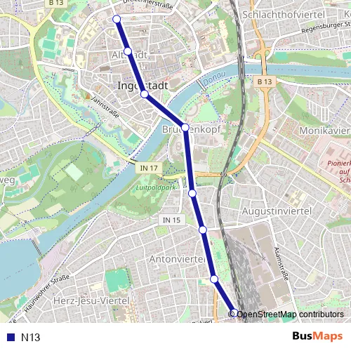 The first stop of the N13 bus route is Ingolstadt, ZOB Steig B and the last stop is