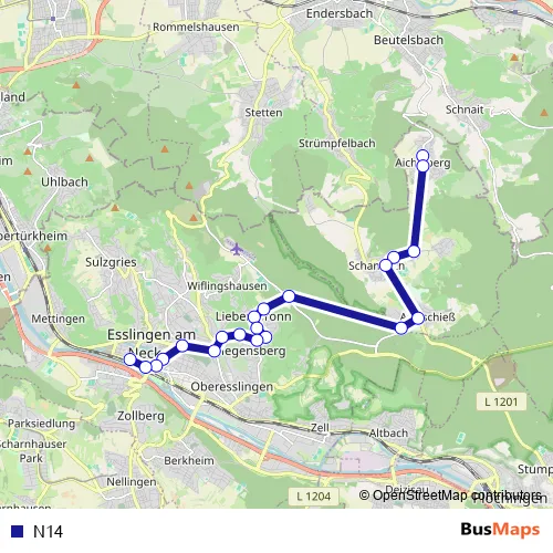 The first stop of the N14 bus route is Aichelberg Holl and the last stop is Esslingen (N) Zob. N14 is operational during on weekends.