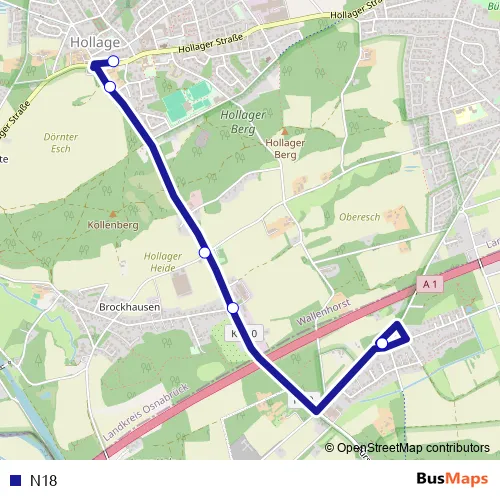 The first stop of the N18 bus route is Hollage Zentrum and the last stop is