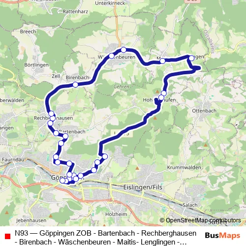The first stop of the N93 bus route is Göppingen Zob and the last stop is Göppingen Zob. N93 (Göppingen ZOB - Bartenbach - Rechberghausen - Birenbach - Wäschenbeuren - Maitis- Lenglingen - Hohenstaufen - Göppingen) is operational during on weekends.