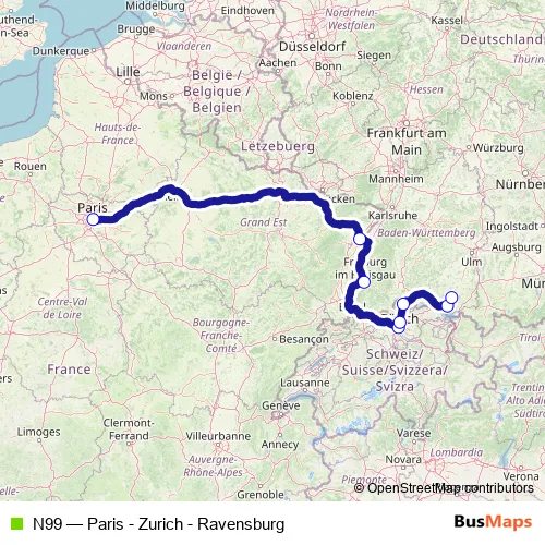 Bus N99 - Paris - Zurich - Ravensburg: Full Schedule in Zuerich