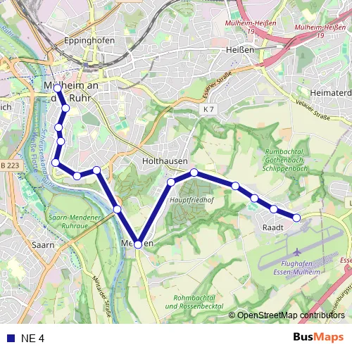 The first stop of the NE 4 bus route is Mülheim Flughafen and the last stop is Mülheim Stadtmitte. NE 4 is operational during everyday.