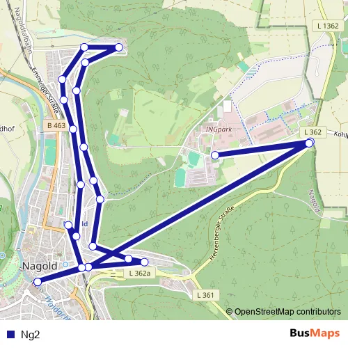 The first stop of the Ng2 bus route is Nagold, Zob and the last stop is Nagold, Zob. Ng2 is operational during everyday.