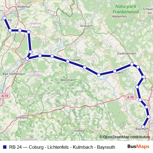 The first stop of the RB 24 rail route is Bayreuth Hbf and the last stop is Coburg. RB 24 (Coburg - Lichtenfels - Kulmbach - Bayreuth) is operational during everyday.