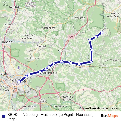 The first stop of the RB 30 rail route is Nürnberg Hbf and the last stop is Neuhaus (Pegn). RB 30 (Nürnberg - Hersbruck (re Pegn) - Neuhaus (Pegn)) is operational during everyday.