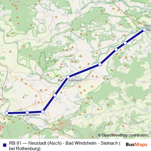 Click here to view the nearest RB 81 - Neustadt (Aisch) - Bad Windsheim - Steinach (bei Rothenburg) rail stop.