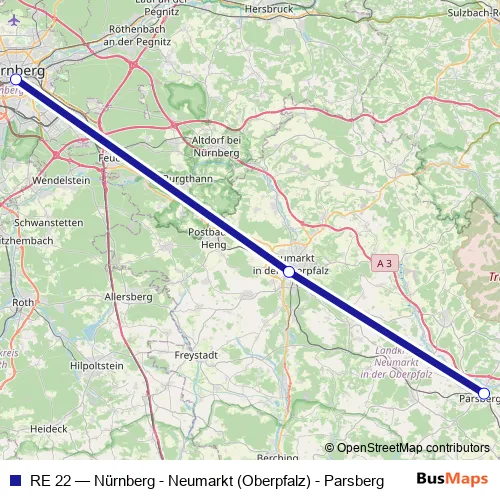 The first stop of the RE 22 rail route is Nürnberg Hbf and the last stop is Parsberg. RE 22 (Nürnberg - Neumarkt (Oberpfalz) - Parsberg) is operational during everyday.