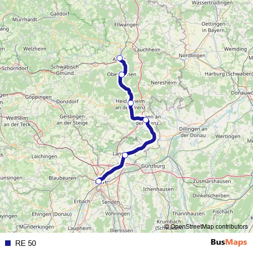 The first stop of the RE 50 rail route is Aalen, Hauptbahnhof and the last stop is Ulm Hbf. RE 50 is operational during everyday.