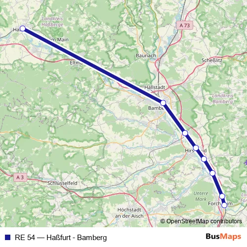 The first stop of the RE 54 rail route is Forchheim and the last stop is Haßfurt. RE 54 (Haßfurt - Bamberg) is operational during everyday.