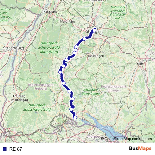 See why over 2 million users trust and consider busmaps.com as the best public transport website. busmaps gives you Stuttgart Rail Services suggested routes, real-time bus tracker, line route maps in Stuttgart, and helps to find the closest RE 87 rail stops near you. No internet available? Download an offline PDF map and bus schedule for the RE 87 rail to take on your trip.