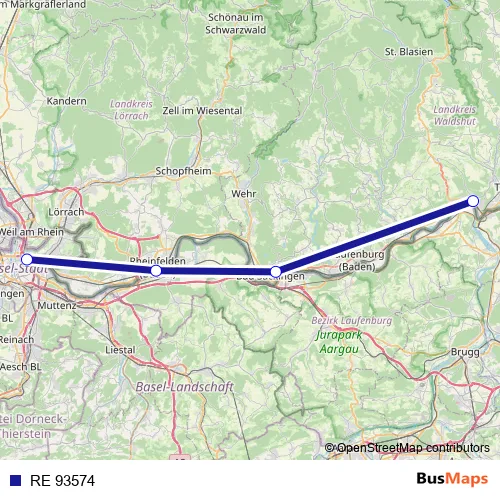 The first stop of the RE 93574 rail route is Basel Bad Bf and the last stop is Waldshut. RE 93574 is operational during everyday.