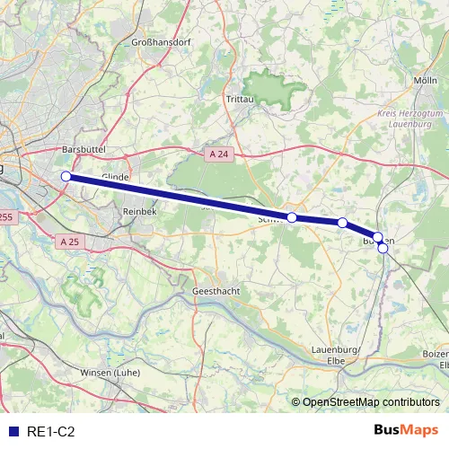 The first stop of the RE1-C2 bus route is Bf. Büchen (Ladestraße) and the last stop is U Steinfurther Allee. RE1-C2 is operational during everyday.