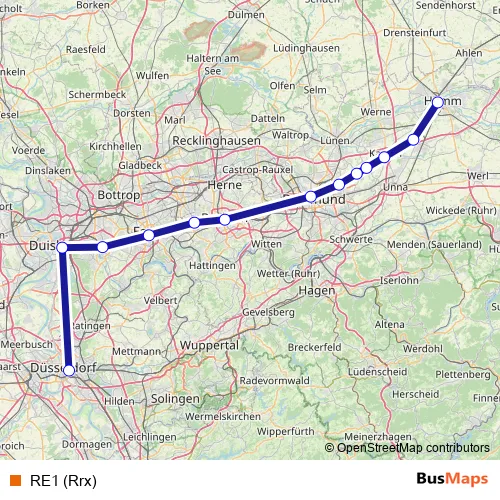 The first stop of the RE1 (Rrx) rail route is Hamm (Westf), Hauptbahnhof and the last stop is Düsseldorf Hbf. RE1 (Rrx) is operational during everyday.