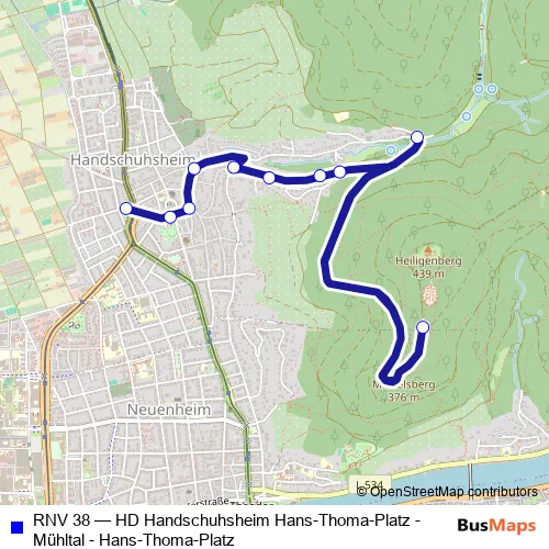 Click here to view the nearest RNV 38 - HD Handschuhsheim Hans-Thoma-Platz - Mühltal - Hans-Thoma-Platz bus stop.