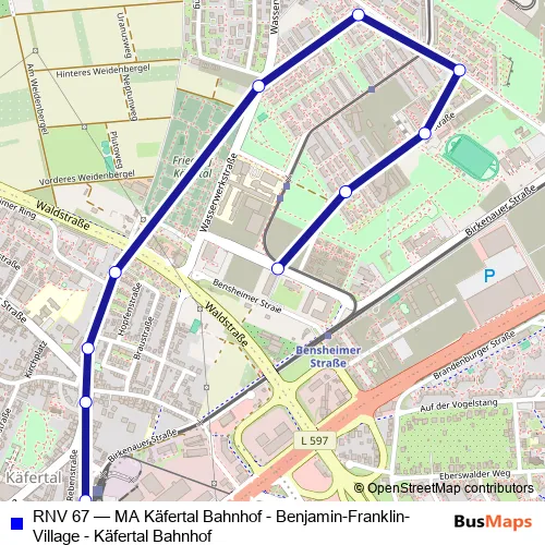 The first stop of the RNV 67 bus route is Käfertal, Funaristraße and the last stop is Käfertal, Bahnhof. RNV 67 (MA Käfertal Bahnhof - Benjamin-Franklin-Village - Käfertal Bahnhof) is operational during everyday.