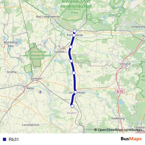 The first stop of the Rb31 bus route is Großenhain, Cottbuser Bahnhof and the last stop is Elsterwerda-Biehla, Bahnhof. Rb31 is operational during everyday.