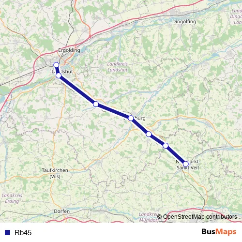 The first stop of the Rb45 bus route is Neumarkt-St Veit and the last stop is Landshut (Bay) Hauptbahnhof. Rb45 is operational during on weekdays.
