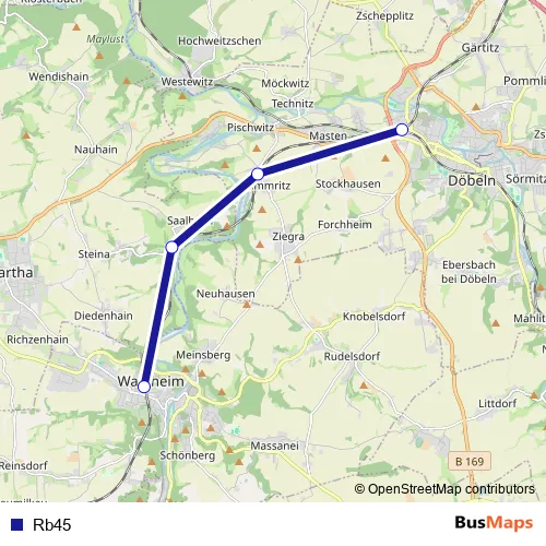 The first stop of the Rb45 bus route is Waldheim and the last stop is Döbeln Hbf. Rb45 is operational during everyday.