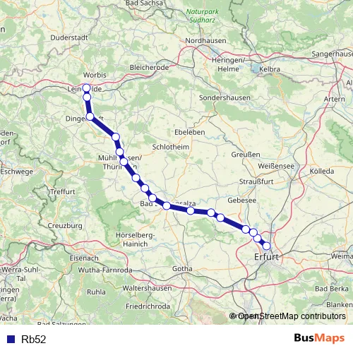 The first stop of the Rb52 rail route is Erfurt Nord and the last stop is Leinefelde. Rb52 is operational during everyday.