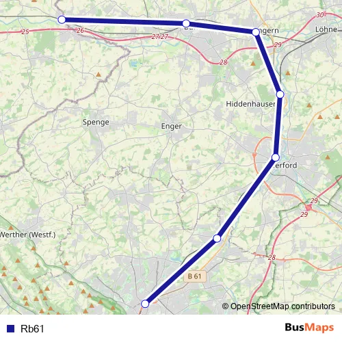 The first stop of the Rb61 bus route is Bünde(Westf) and the last stop is Bielefeld Hbf. Rb61 is operational during everyday.