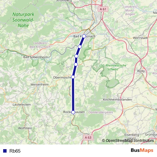 See why over 2 million users trust and consider busmaps.com as the best public transport website. busmaps gives you Bad Kreuznach Buses suggested routes, real-time bus tracker, line route maps in Bad Kreuznach, and helps to find the closest Rb65 bus stops near you. No internet available? Download an offline PDF map and bus schedule for the Rb65 bus to take on your trip.