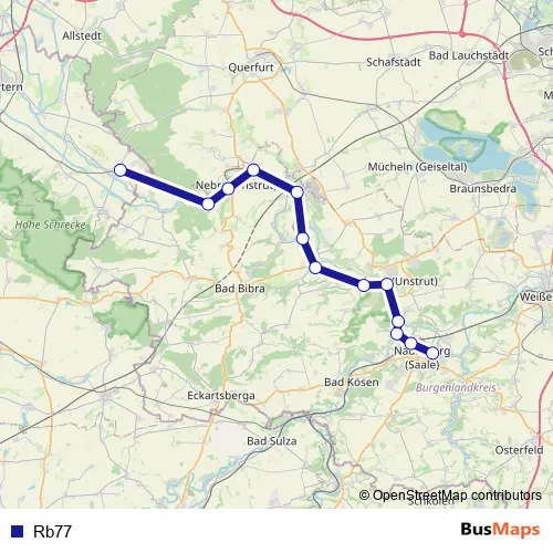 The first stop of the Rb77 rail route is Wangen(Unstrut) and the last stop is