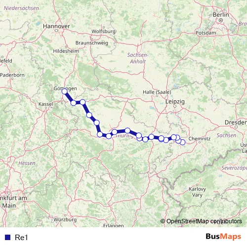 The first stop of the Re1 rail route is Weimar and the last stop is Glauchau (Sachs). Re1 is operational during everyday.