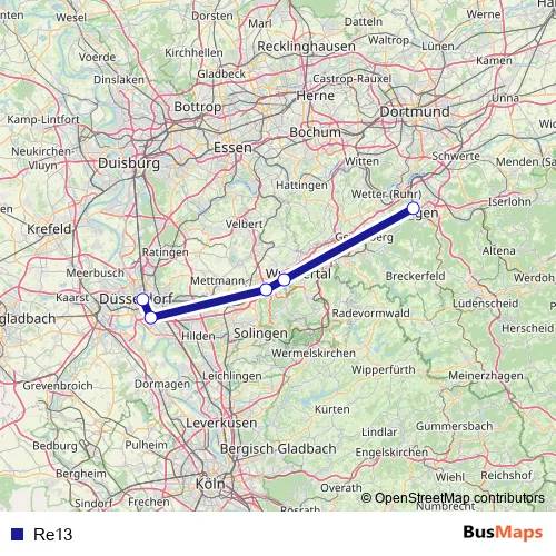 The first stop of the Re13 bus route is Hauptbahnhof, Düsseldorf and the last stop is Hauptbahnhof, Hagen (Westf). Re13 is operational during everyday.