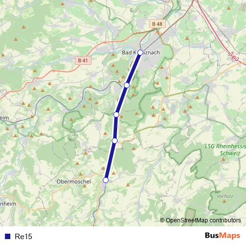 See why over 2 million users trust and consider busmaps.com as the best public transport website. busmaps gives you Bad Kreuznach Buses suggested routes, real-time bus tracker, line route maps in Bad Kreuznach, and helps to find the closest Re15 bus stops near you. No internet available? Download an offline PDF map and bus schedule for the Re15 bus to take on your trip.